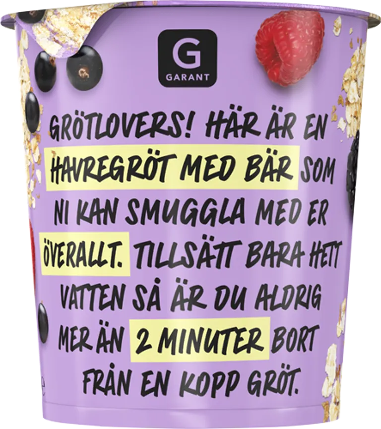 Grötkopp med bär. Här är en havregröt med bär som ni kan smuggla med er överallt. Tillsätt bara hett vatten så är du aldrig mer än 2 minuter bort från en kopp gröt. 65 gram.