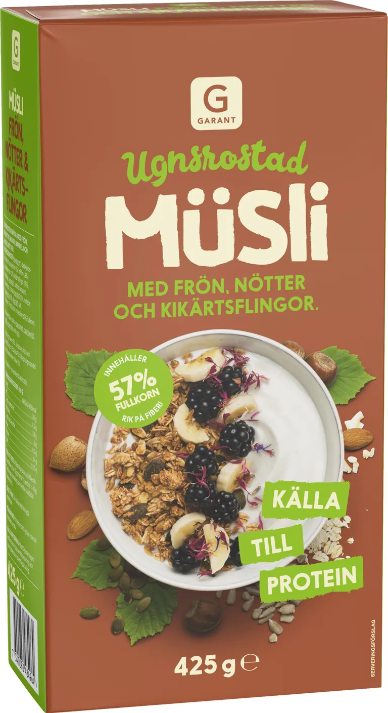 Ugnsrostad musli med frön, nötter och kikärtsflingor. Källa till protein. 425 gram.
