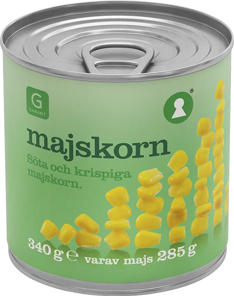 Söta och krispiga majskorn. 340 gram, avrunnen vikt 285 gram.