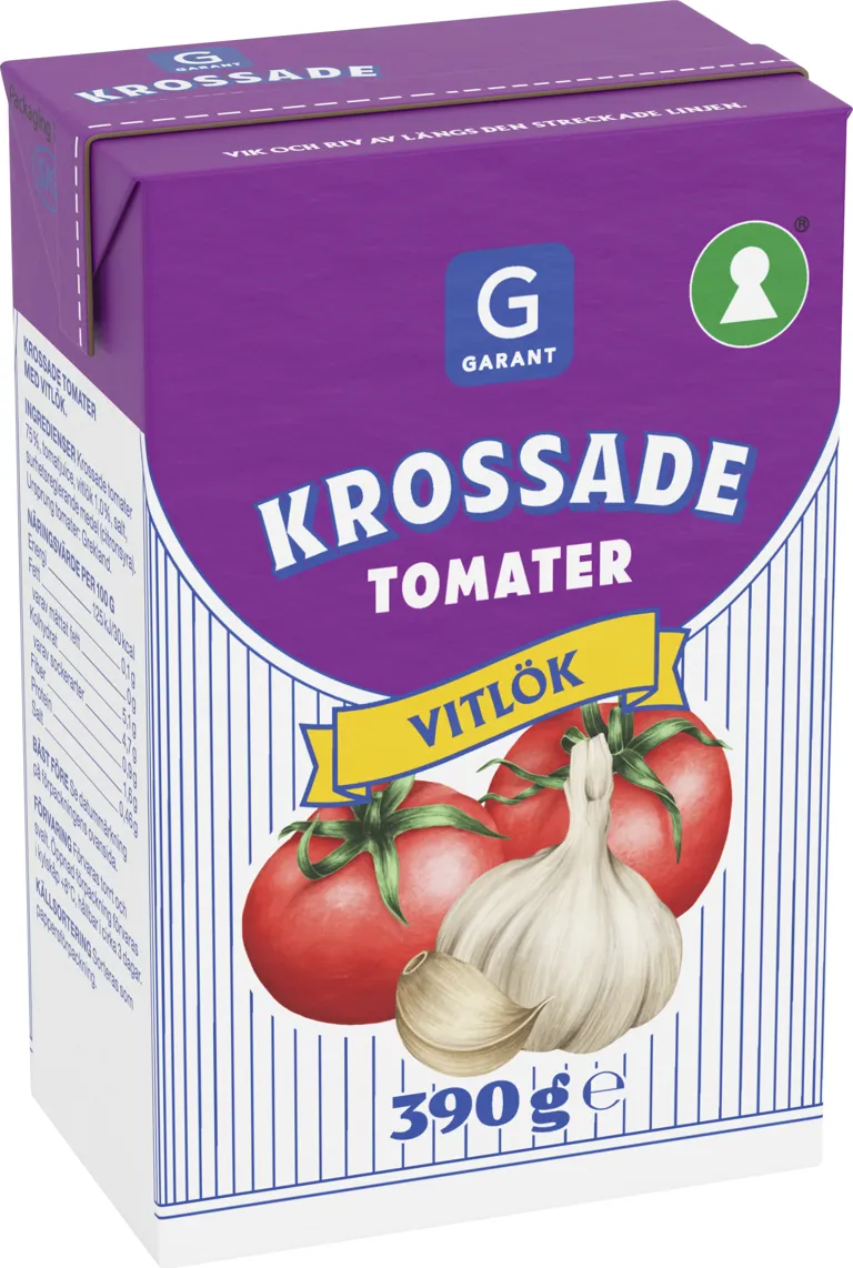 Krossade tomater 75%, tomatjuice, vitlök 1%, salt, surhetsreglerande medel (citronsyra).