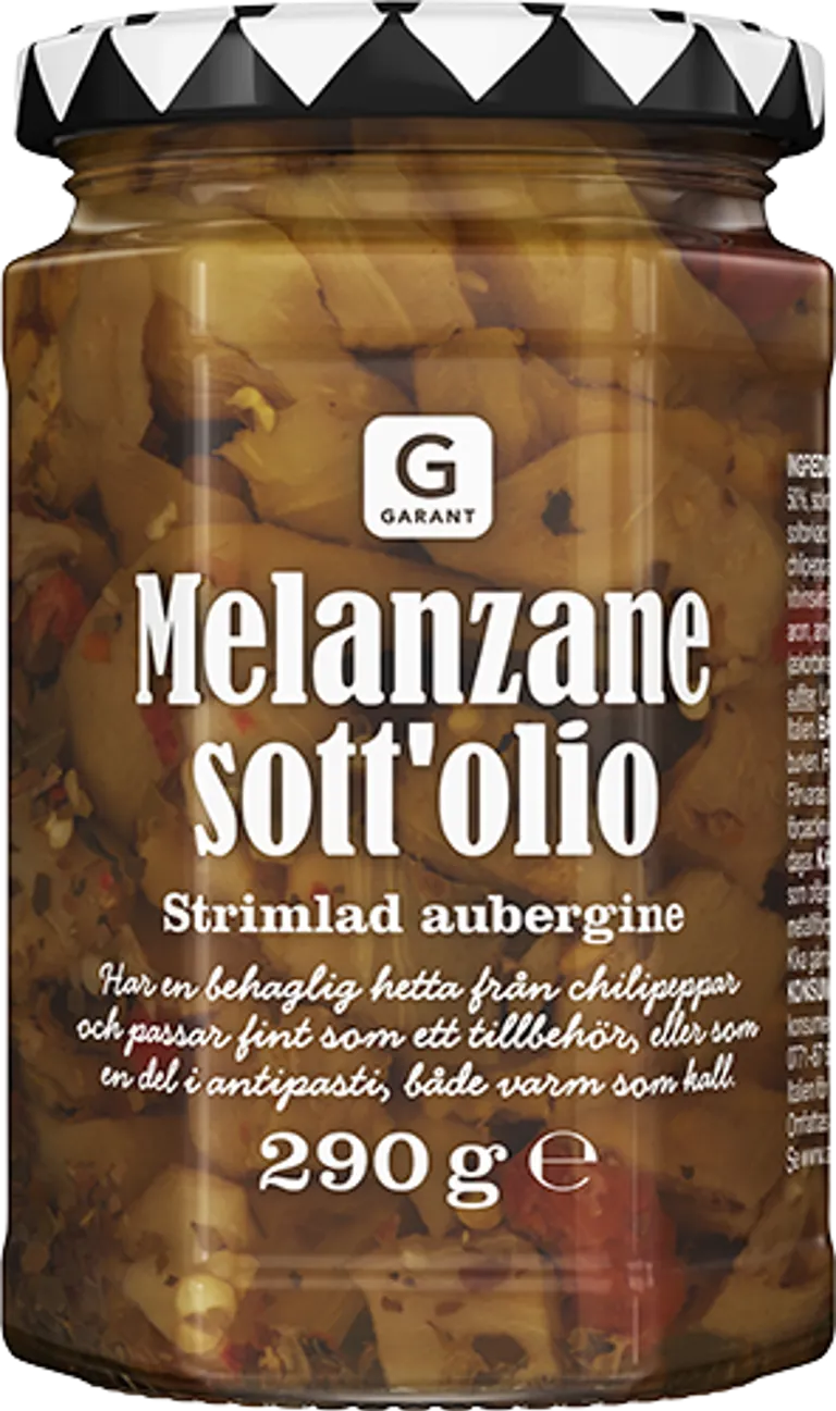 Melanzane sott'olio. Strimlad aubergine med behaglig hetta från chilipeppar och passar fint som tillbehör, eller en del i antipasti, både varm som kall. 290 gram.