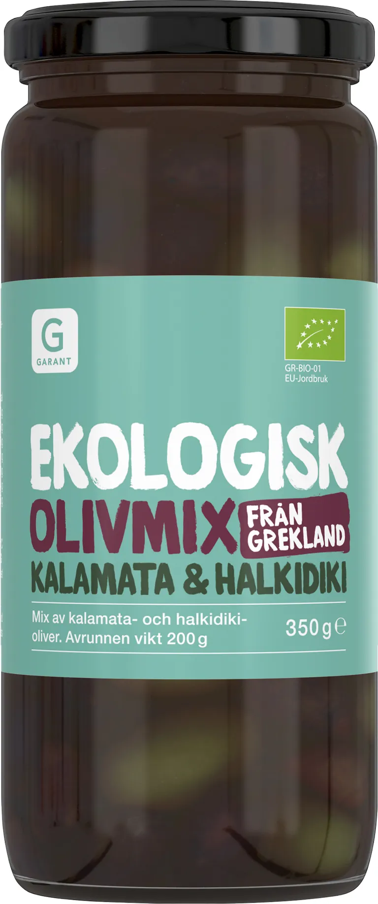 Ekologisk olivmix med kalamon och halkidiki. Grekiska oliver med kärnor. 350 gram, avrunnen vikt 200 gram.