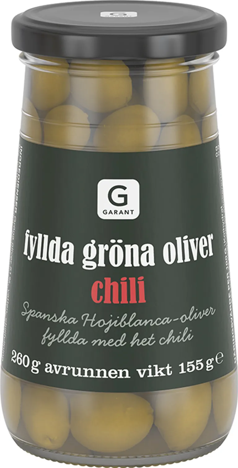 Gröna oliver fyllda med het chili. 260 gram avrunnen vikt 155 gram.