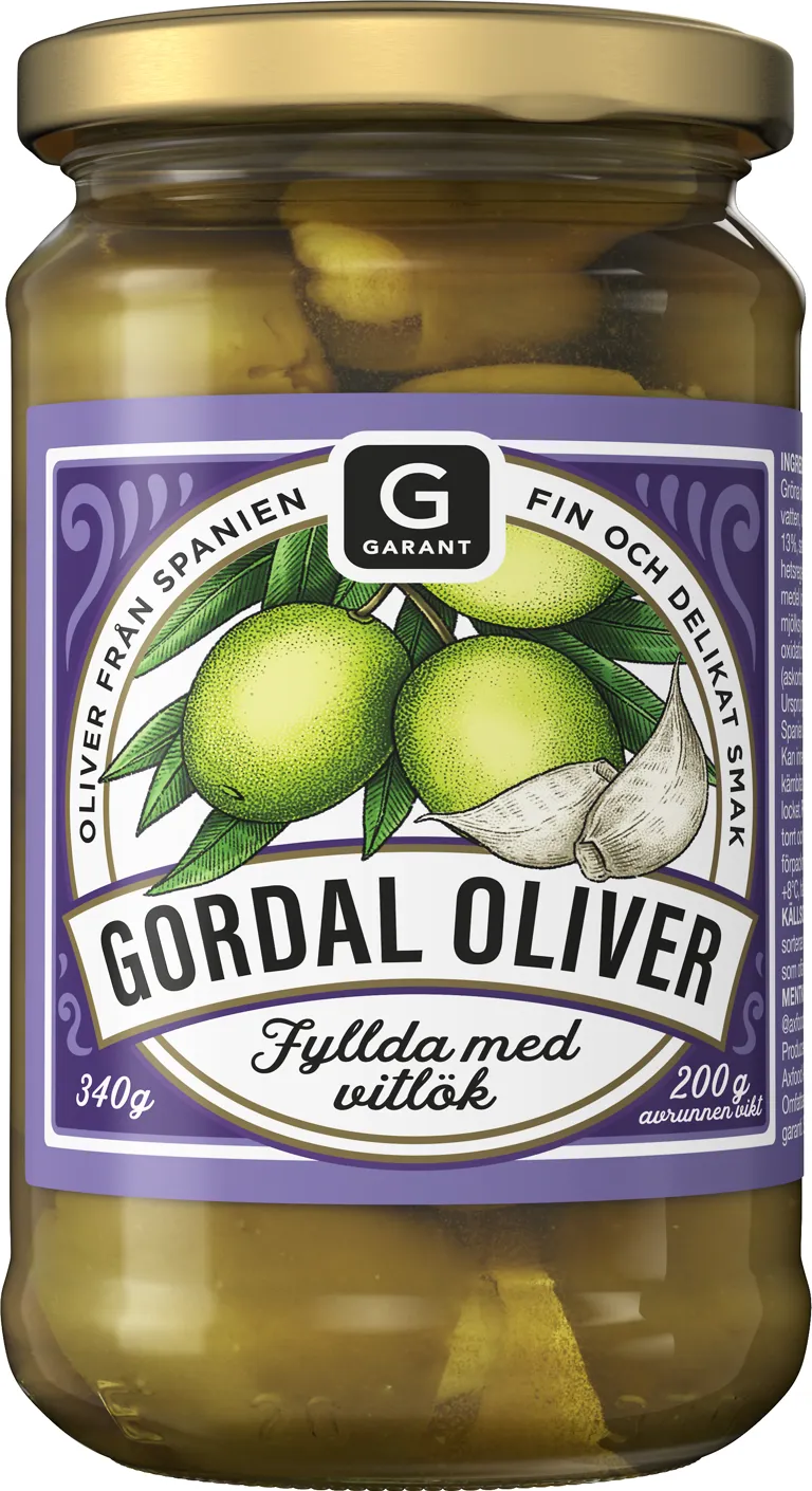 Gordal oliver fyllda med vitlök. 340 gram varav 200 gram avrunnen vikt.