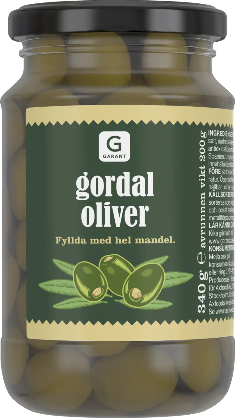 Gordal oliver fyllda med hel mandel. 340 gram, avrunnen vikt 200 gram.