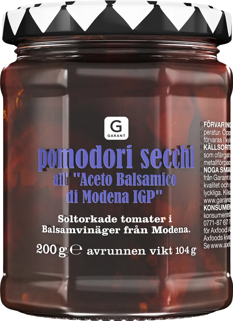 Pomodori secchi all ”Aceto Balsamico di Modena IGP”. Soltorkade tomter i balsamvinäger från Modena. 200 gram, avrunnen vikt 104 gram.