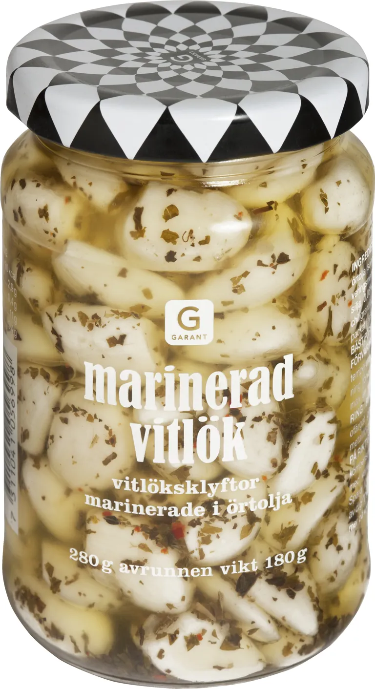Marinerad vitlök. Vitlöksklyftor marinerade i örtolja. 280 gram, vikt 180 gram.