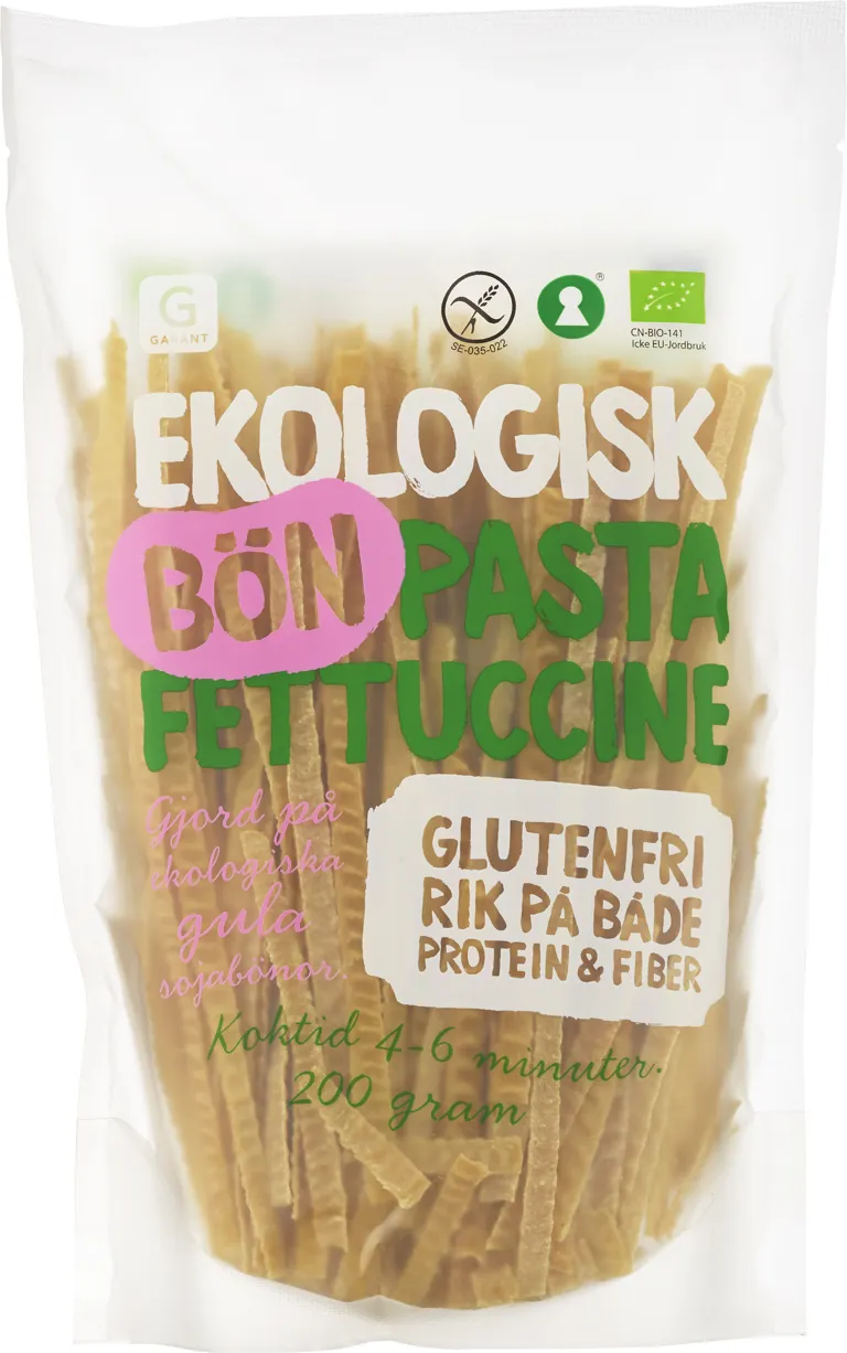 Ekologisk bönfettuccine gjord på gröna sojabönor. Glutenfri, rik på protein och fiber. 200 gram.