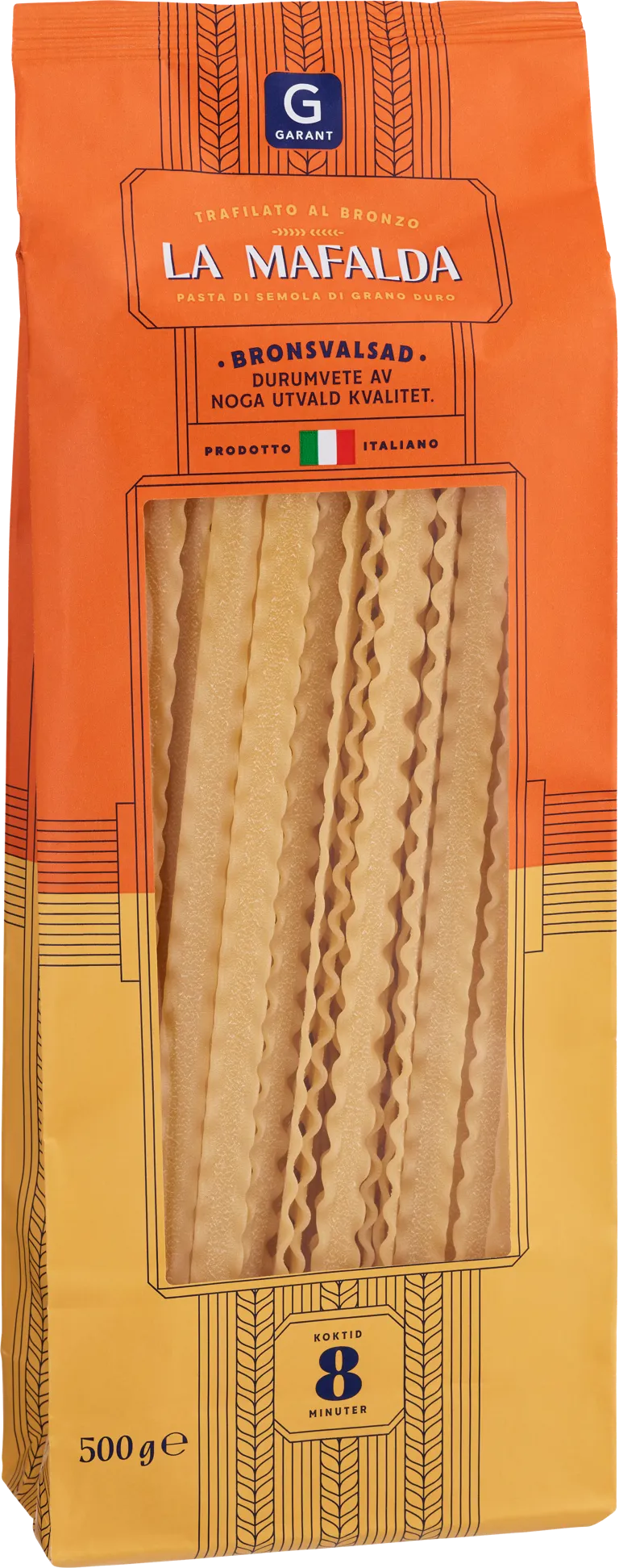 La mafalda. Bronsvalsad pasta gjord av durumvete av noga utvald kvalitet. 500 gram.