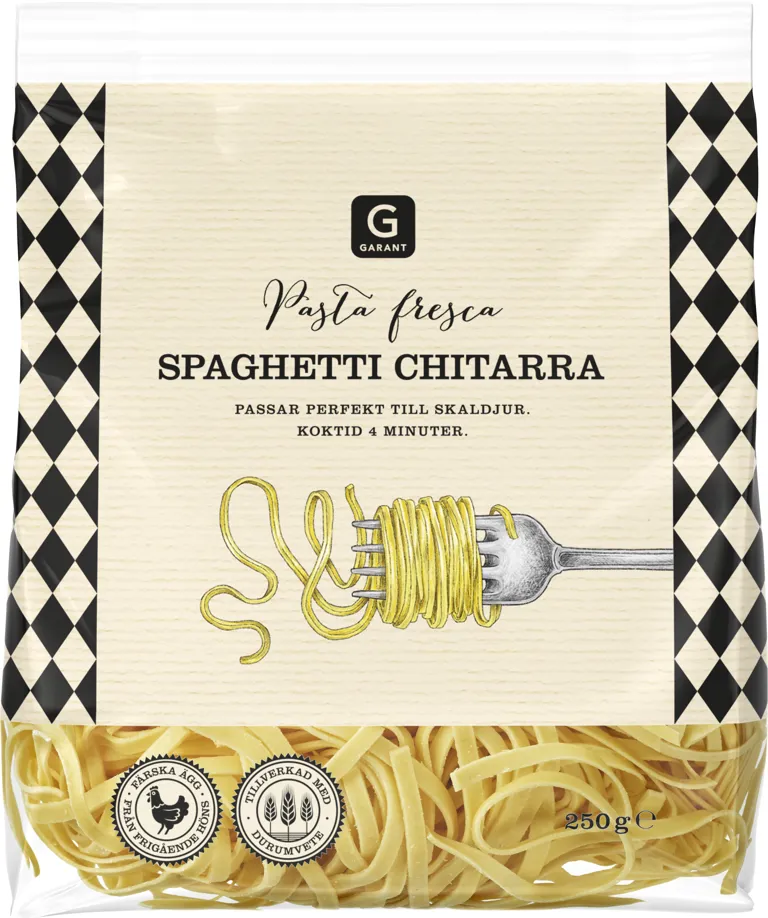Färsk spaghetti chitarra. Passar perfekt till skaldjur. Tillverkad med durumvete och färska ägg. 250 gram.