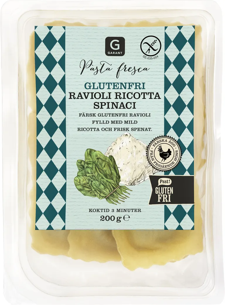 Färsk italiensk glutenfri ravioli fylld med mild ricotta och frisk spenat. Koktid 3 minuter.