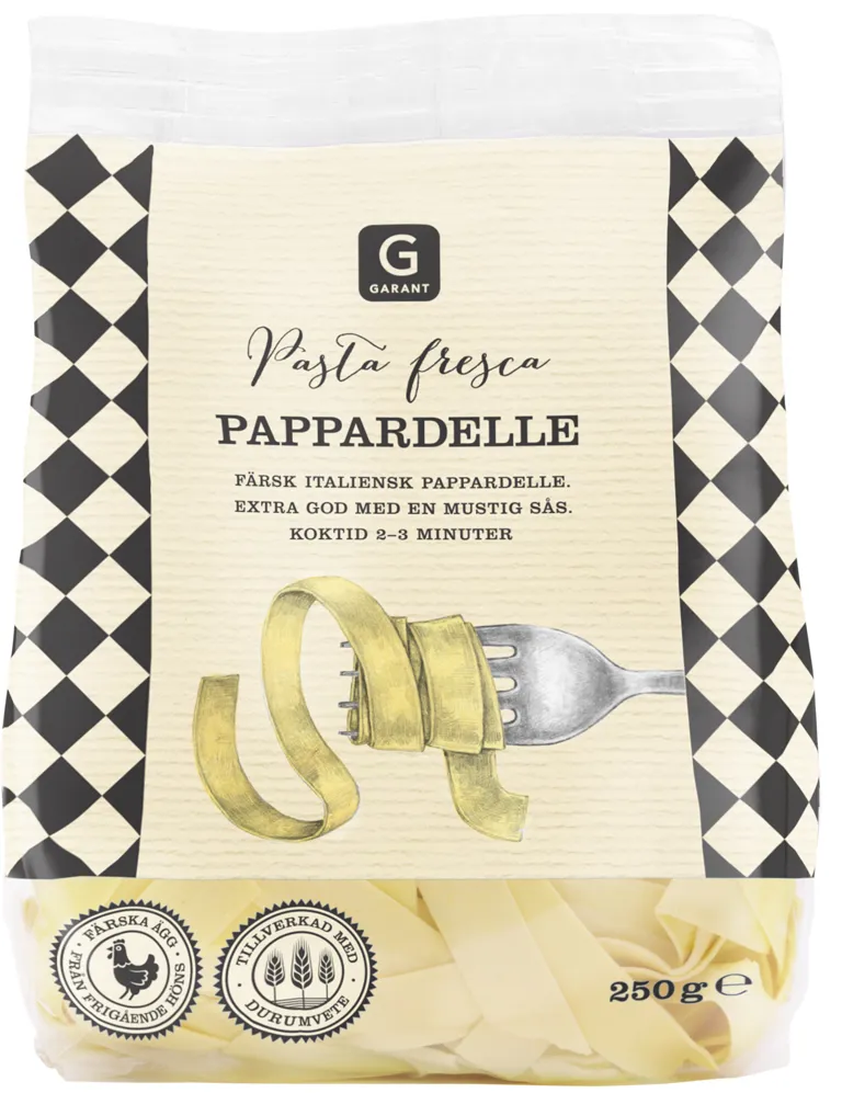 Färsk italiensk pappardelle. Extra god med en mustig sås. Tillverkad med durumvete och färska ägg. 250 gram.