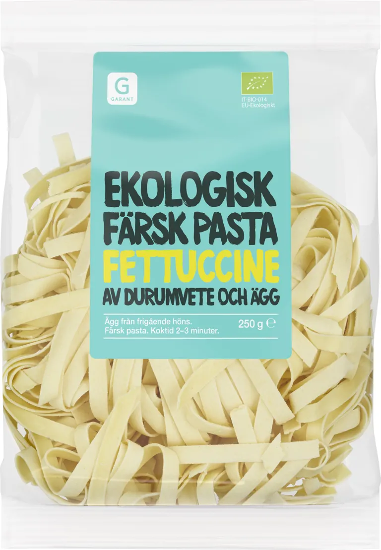 Ekologisk färsk fettuccine av durumvete och ägg från frigående höns. 250 gram.