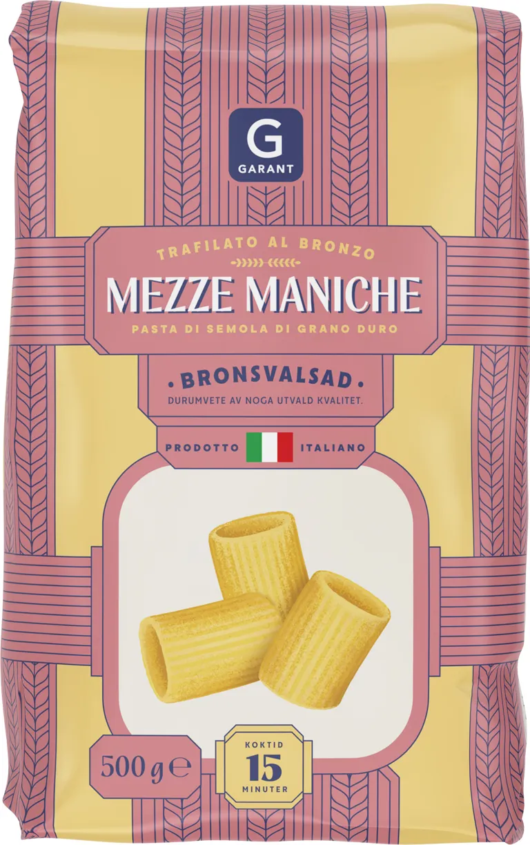 Mezze Maniche. Bronsvalsad pasta gjord av durumvete av noga utvald kvalitet. 500 gram.