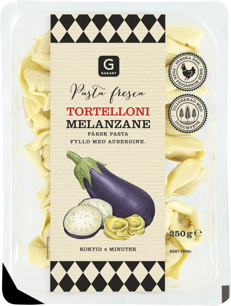 Färsk tortelloni melanzane fylld med aubergine. Tillverkad med durumvete och färska ägg. 250 gram.