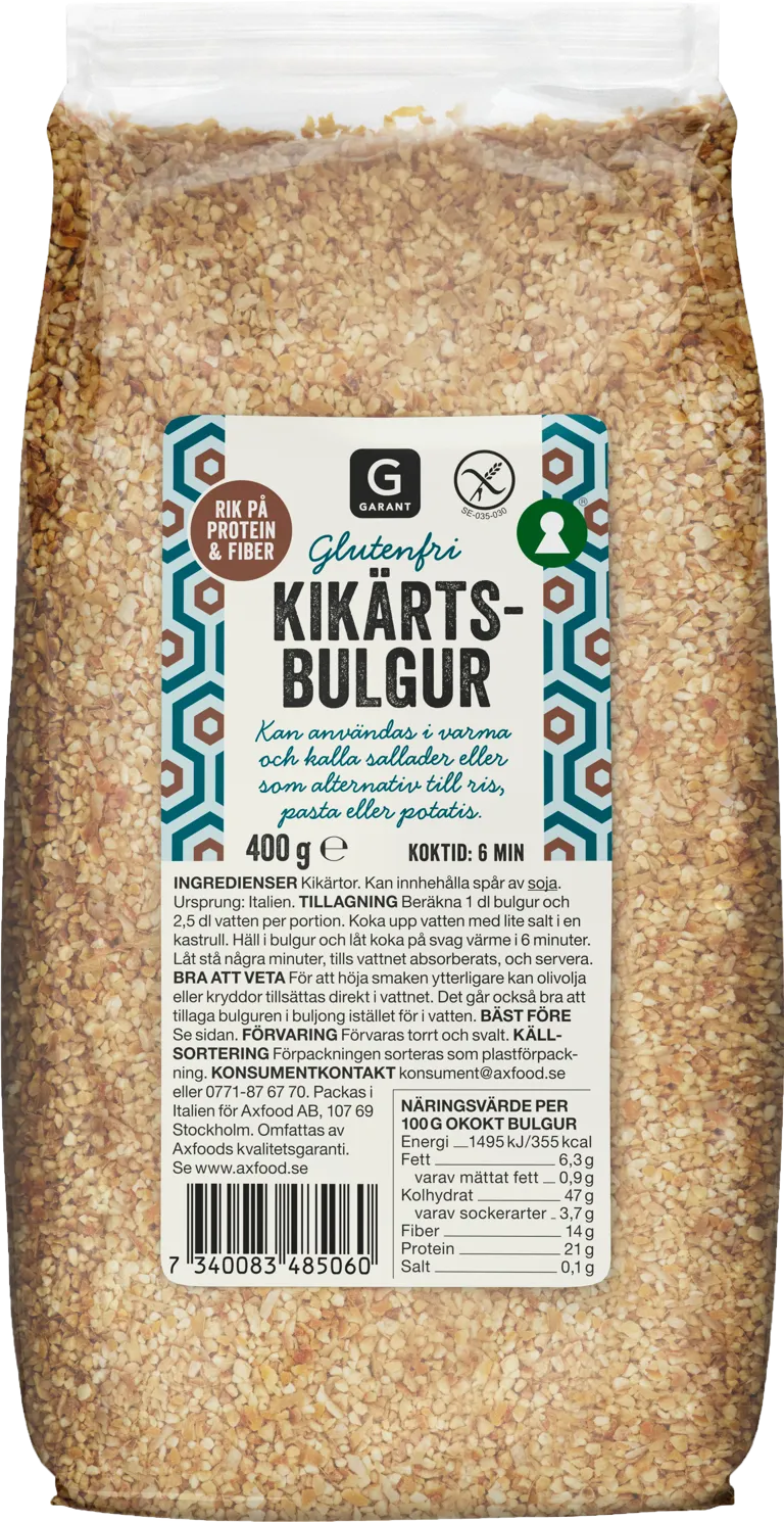 Vår kikärtsbulgur är märkt med det överkorsade axet från Svenska Celiakiförbundet. Märkningen intygar att en produkt med säkerhet är glutenfri. Nyckelhålet gör det enklare att välja hälsosamt. Mindre och nyttigare fett, mindre socker och salt, mer kostfiber och fullkorn! Glöm inte att vara snäll mot miljön! Sortera påse som plastförpackning i materialåtervinningen.