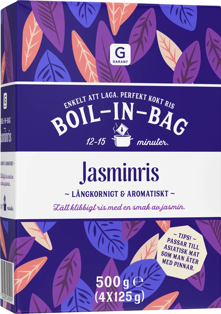 Jasminris boil-in-bag. Enkelt att laga perfekt kokt ris. Lånkorningt och aromatiskt lätt klibbigt ris med smak av jasmin. Tips! Passar till asiatisk mat man äter med pinnar. 4 x 125 gram.