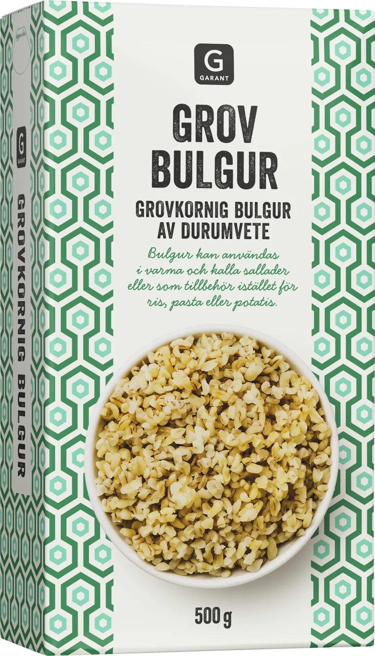 Grovkorning bulgur av durumvete. Kan användas i varma och kalla sallader eller som tillbehör istället för ris, pasta eller potatis. 500 gram.
