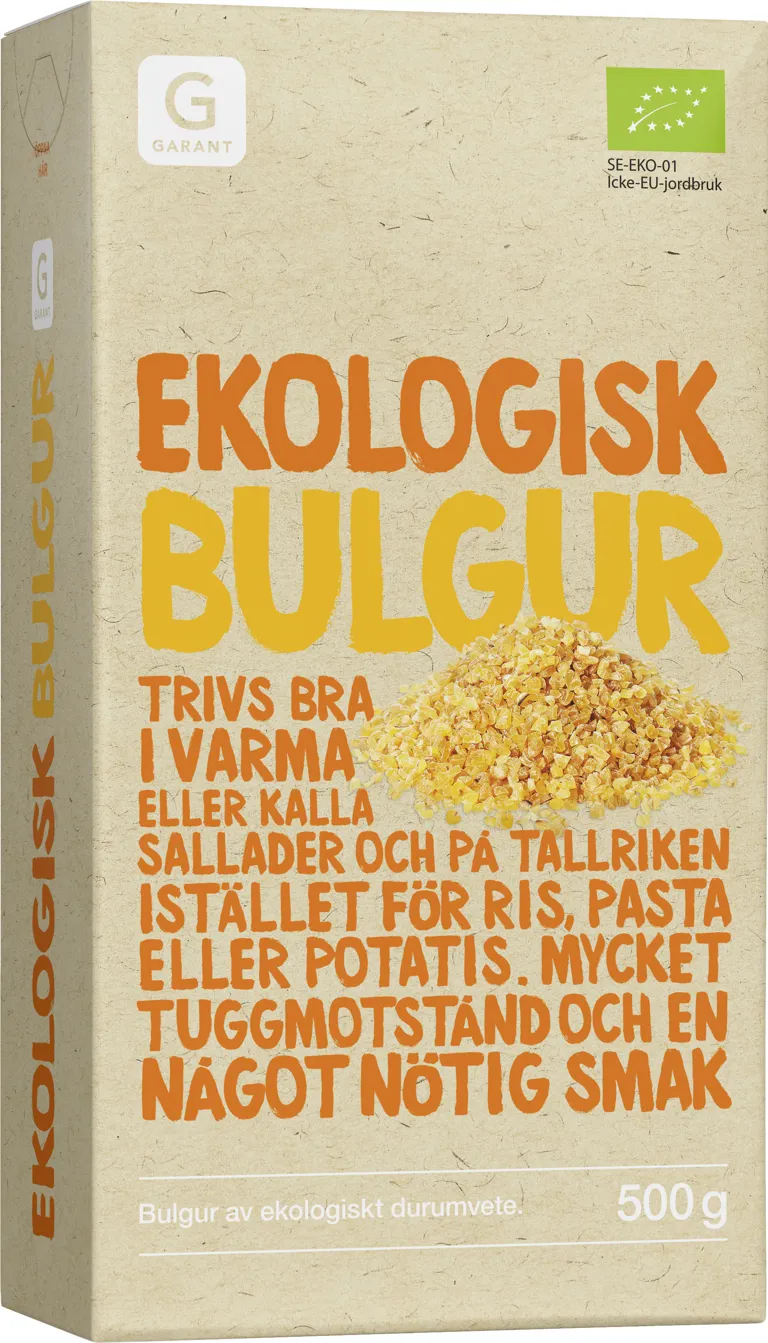Bulgur av ekologiskt durumvete. Trivs bra i varma eller kalla sallader och på tallriken istället för ris, pasta eller potatis. Mycket tuggmotstånd och en något nötig smak. 500 gram.