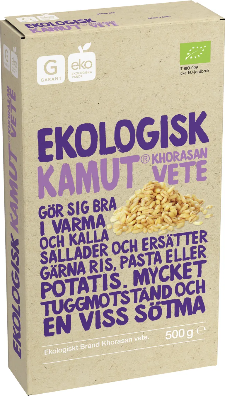 Ekologisk Kamut, Khorasan vete. Gör sig bra i varma och kalla sallader och ersätter gärna ris, pasta eller potatis. Mycket tuggmotstånd och en viss sötma. Kamut khorasan vete är en gammal vetesort som ursprungligen odlades i Egypten. Det har värmebehandlats så att vitaminer och mineraler ångas i kärnan och blir kvar även efter att kärnorna har skalats. Värmebehandlingen minskar även koktiden. Vetet har en något söt spannmålssmak och mycket tuggmotstånd. Garants ekomärkning talar om att en vara är ekologisk och ibland även KRAV-märkt. Vårt sortiment fylls hela tiden på med fler EKO-varor. 500 g.