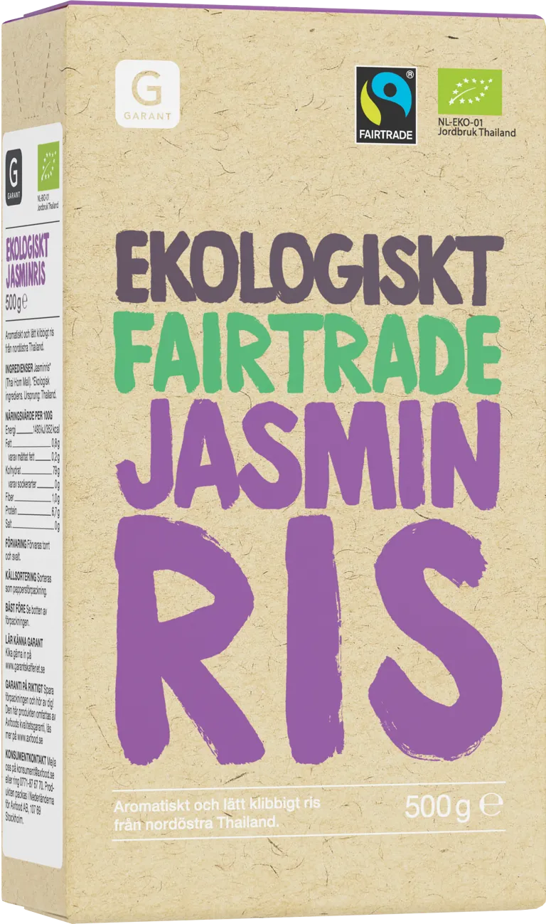 Ekologiskt fairtrade jasminris. Aromatiskt lätt klibbigt ris från nordöstra Thailand. 500 gram.