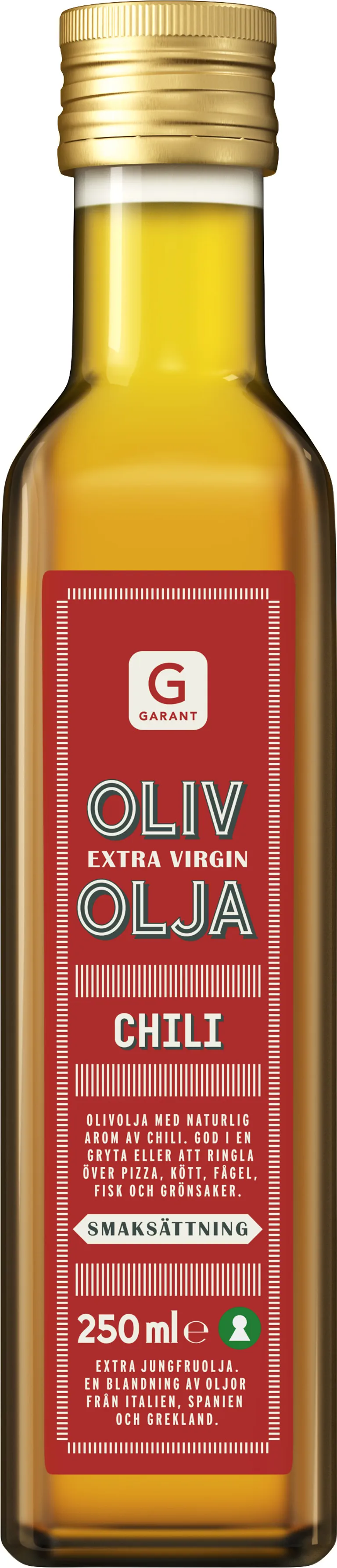 Olivolja med naturlig arom av chili. God i en gryta eller att ringla över pizza, kött, fågel, fisk och grönsaker. 250 ml.