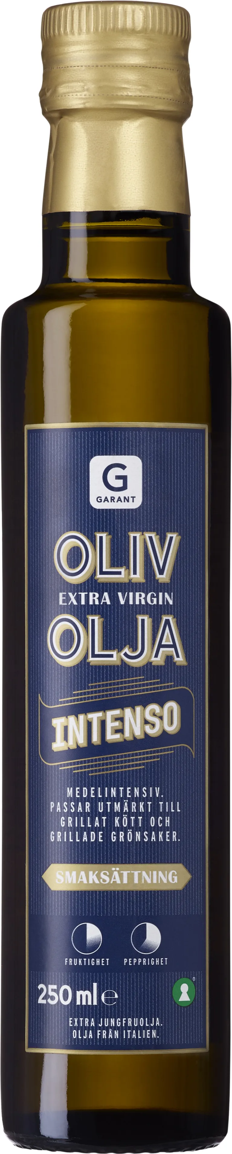 Extra virgin olivolja intenso. Medelintensiv olivolja som passar utmärkt till grillat kött och grillade grönsaker. 250 ml.