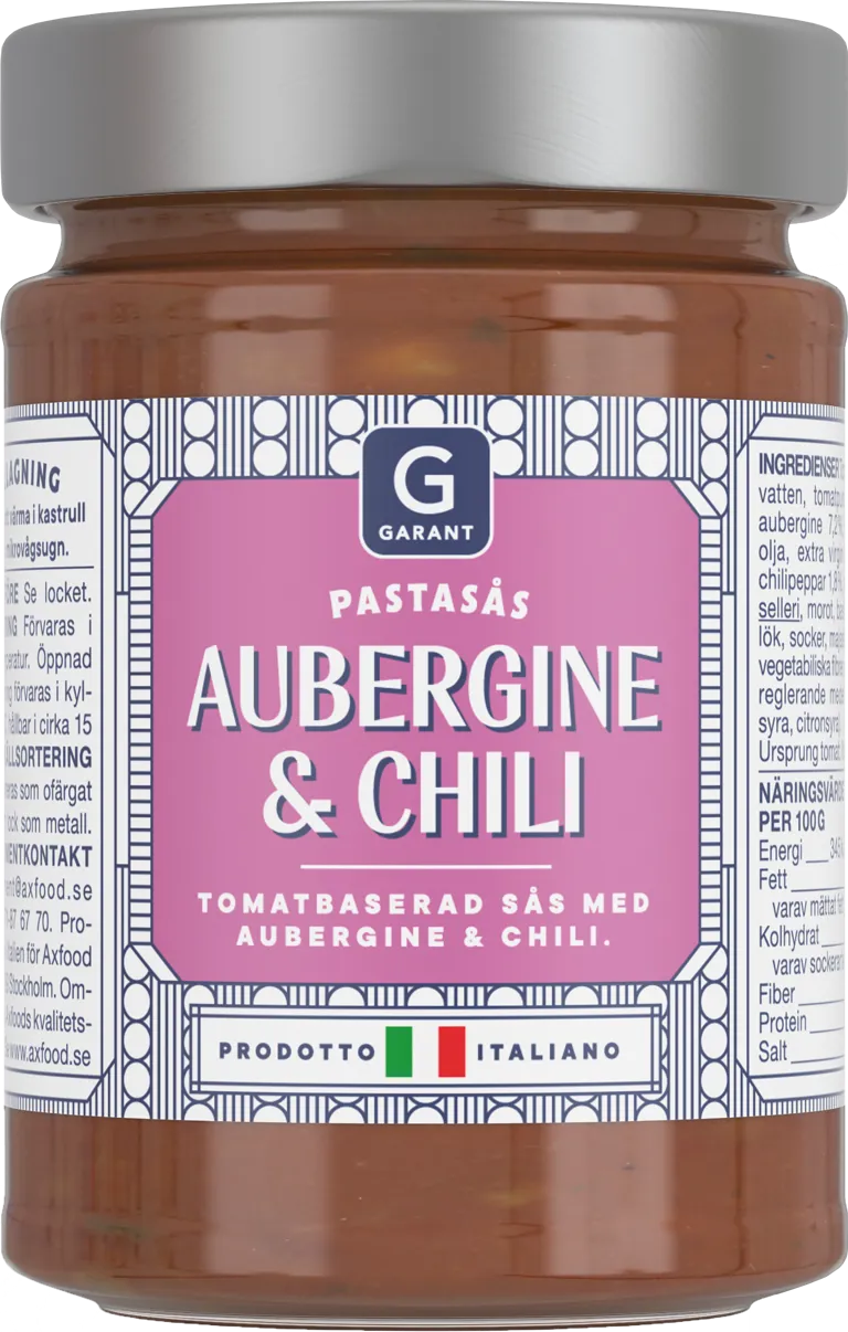 Tomat, vatten, tomatpuré, aubergine 7,2%, solrosolja, extra virgin olivolja, chilipeppar 1,8%, salt, lök, SELLERI, morot, basilika, vitlök, socker, majsstärkelse, vegetabiliska fibrer, surhetsreglerande medel (mjölksyra, citronsyra).