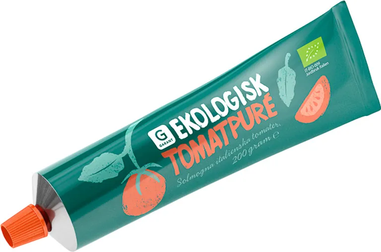 Tomatpuré* (dubbel koncentrerad), salt. *Ekologisk råvara.