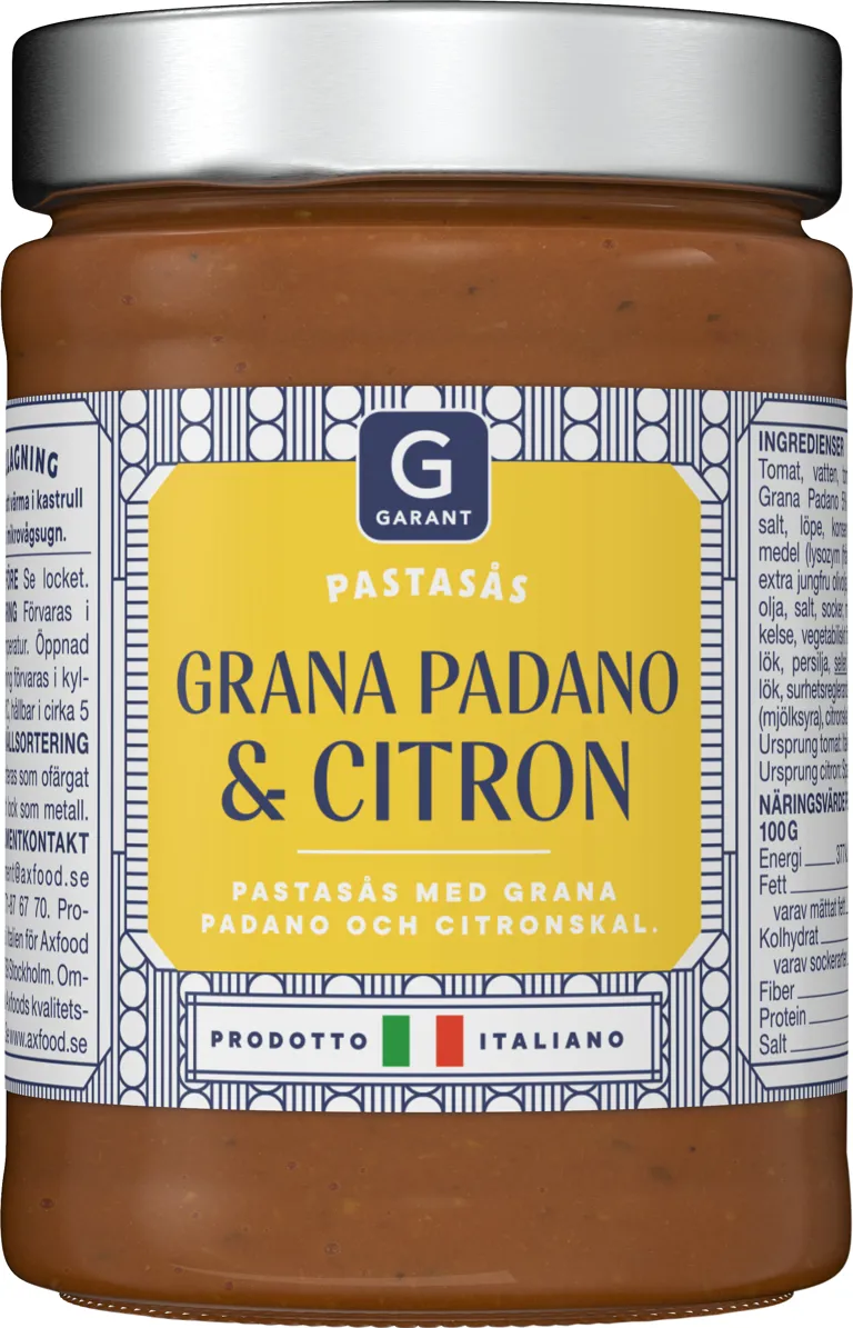 Tomat, vatten, tomatpuré, Grana Padano 5% (MJÖLK, salt, löpe, konserveringsmedel (lysozym (från ÄGG))), extra jungfru olivolja, solrosolja, salt, socker, majsstärkelse, vegetabiliskt fiber, vitlök, persilja, SELLERI, morot, lök, surhetsreglerande medel (mjölksyra), citronskal 0,4%.