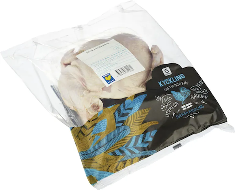 Ingredienser: Hel färsk kyckling (100%). KLASS A. URSPRUNG Sverige.