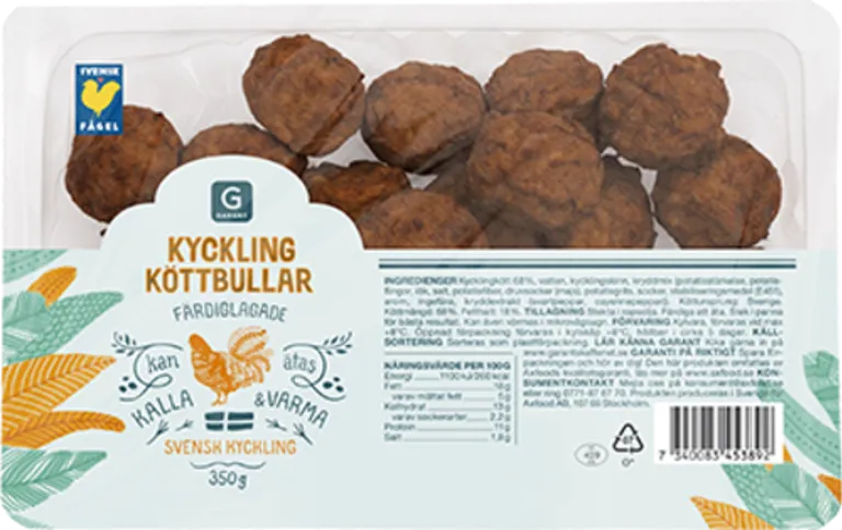 Färdiglagade kycklingköttbullar. Kan ätas varma eller kalla. Svensk kyckling. 350 gram.