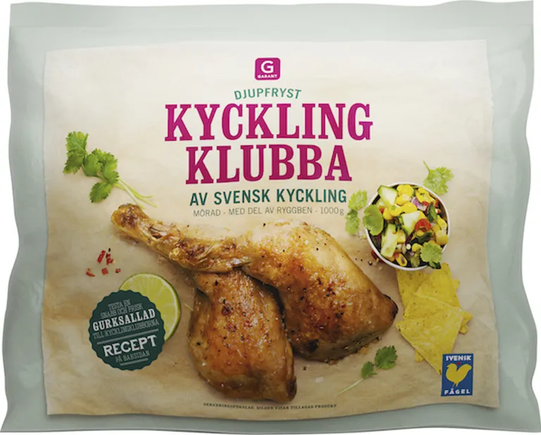 Ingredienser: Kycklingklubba med del av ryggben 87%, saltlake (vatten, salt). Köttursprung: Sverige.