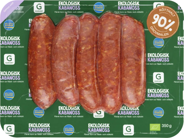 Ekologisk färsk kabanoss. Grovmalen med 90% kötthalt med kött från Sverige. 350 gram.