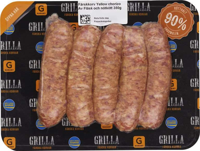 Färsk grovmalen chorizo med smak av gul paprika och chili. 90% kötthalt. 350 gram.