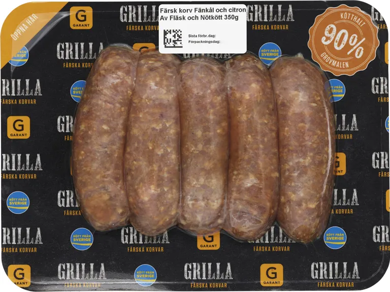 Grovmalen färskkorv med smak av fänkål och citron, gjord på svenskt fläsk- och nötkött med 90% köttmängd. Märkningen Kött från Sverige visar att köttet i produkten kommer från djur som är födda och uppfödda i Sverige. Produkten är även förädlad och förpackad i Sverige.