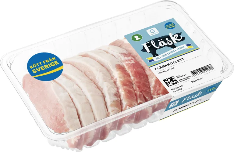 Kika närmare på vår fina fläskkotlett! Trivs bra både i stekpannan och på grillen tillsammans med lagom mycket salt och peppar. Smakligt kött! Märket Kött från Sverige visar att köttet i produkten kommer från djur som är födda och uppfödda i Sverige. Produkten är även förädlad och förpackad i Sverige.