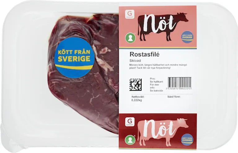 Kika närmare på en finfin rostasfilé! Trivs bra både i stekpannan och på grillen tillsammans med lagom mycket salt och peppar. Smakligt kött! Märket Kött från Sverige visar att köttet i produkten kommer från djur som är födda och uppfödda i Sverige. Produkten är även förädlad och förpackad i Sverige.