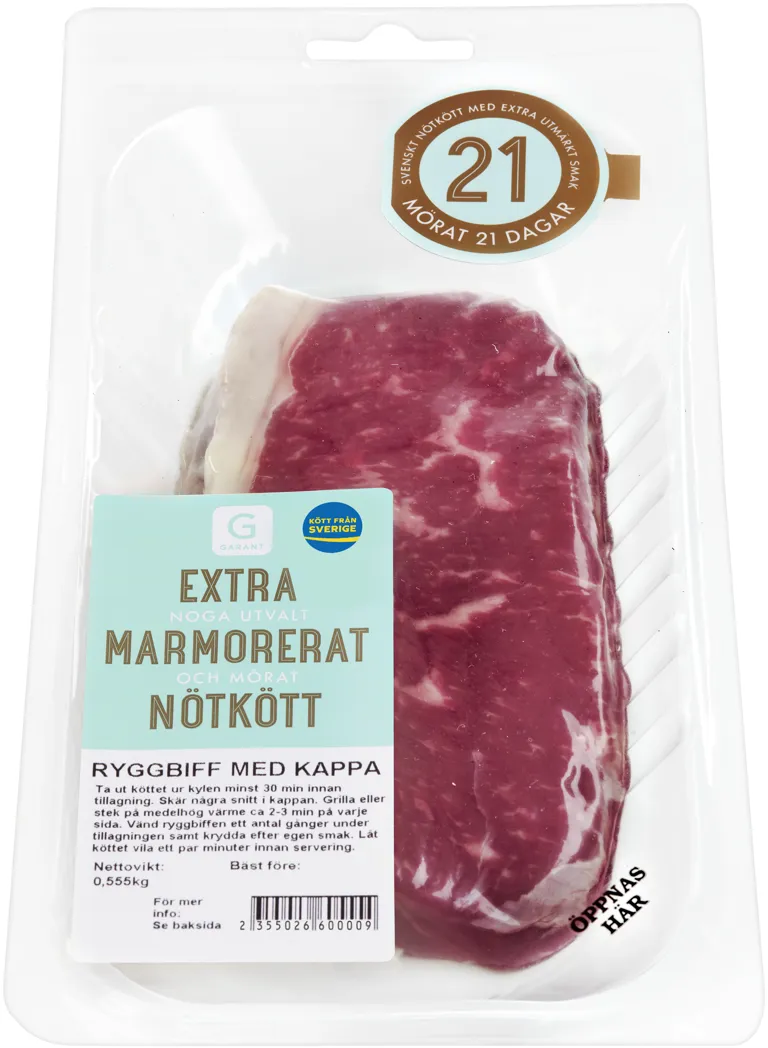 Ryggbiff med kappa. Extra noga utvalt marmorerat och mörat nötkött. Mörat 21 dagar. Kött från Sverige. 250 gram.