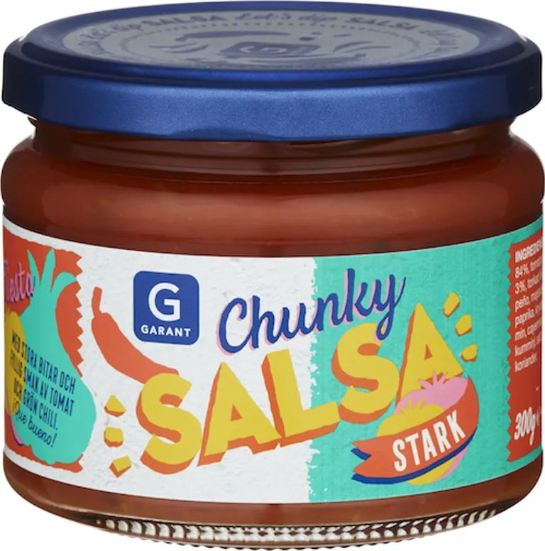 Tomat 84%, tomatpuré, grön chili 3%, torkad lök, ättika, jalapeño, majsstärkelse, grön paprika, kryddor (spiskummin, cayennepeppar, chili, kummin), salt, vitlök, koriander.