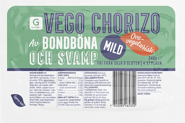 Rehydrerat bondböneprotein 60%, solrosolja, champinjoner 12%, ÄGGVITEPROTEIN, naturlig arom, kryddor (paprika, vitpeppar, koriander, vitlök, cayennepeppar, kummin, muskot, ingefära, muskotblomma, chilipeppar), salt, majsmjöl, syra (citronsyra), havrefiber, ärtprotein, paprikaextrakt.